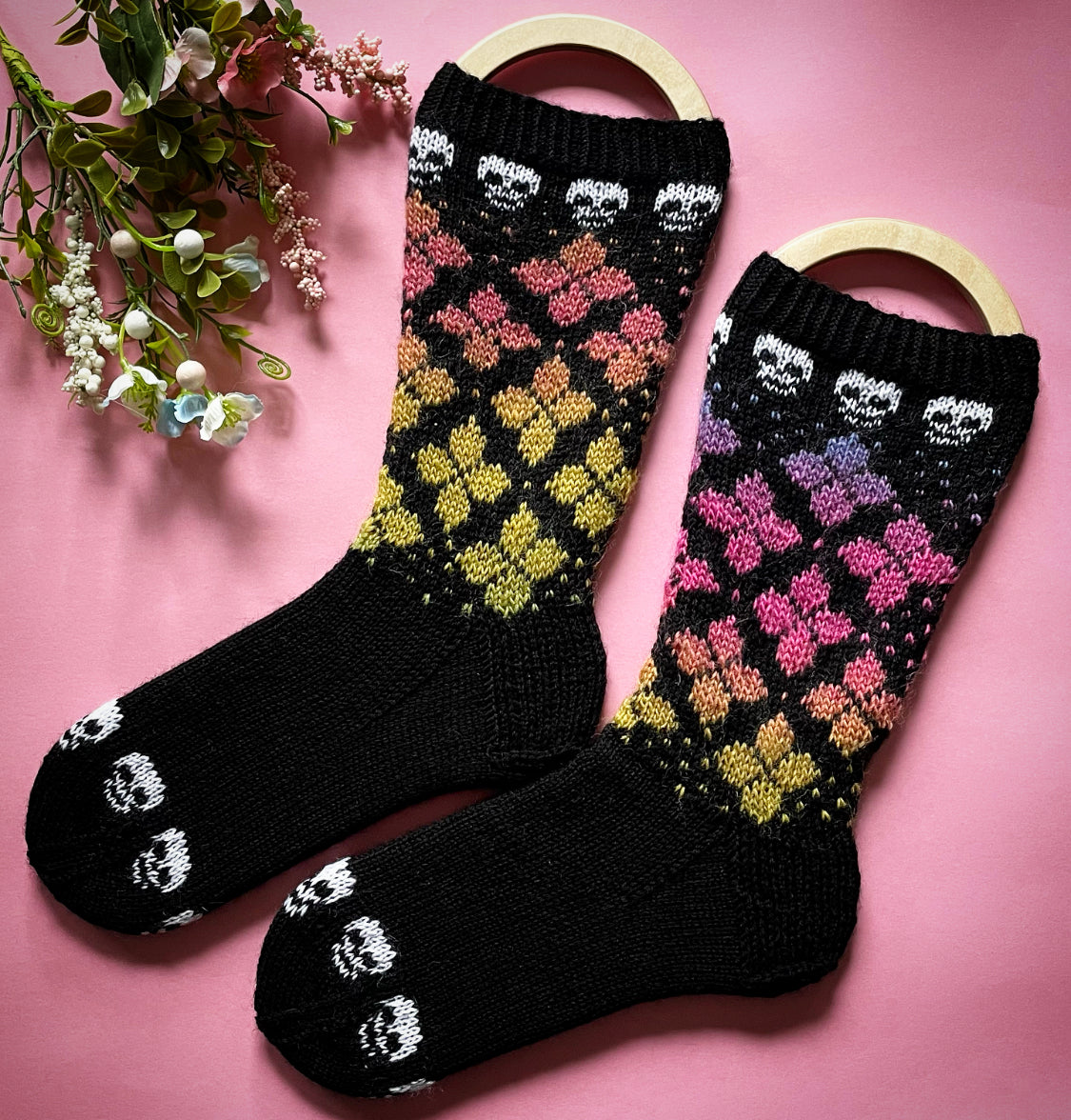 Sukissa kirjoneulekuvio, jossa pääkalloja ja kukkia.